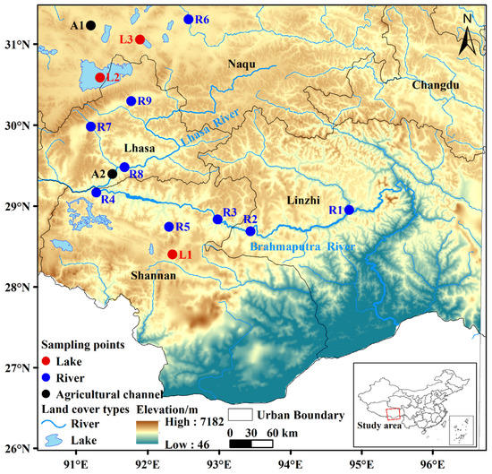 A major objective of this study was to compare the MP abundances and compositions between the upper and lower reaches of the Brahmaputra River (before and after the Lhasa River). Hence, water samples were collected from the lower reaches of the Brahmaputra River (the data of upstream river were obtained from []), the Lhasa River, and surrounding water bodies. Obtaining sediments from some sampling sites was difficult due to the terrain conditions of the plateau; thus, only eight sediment samples were obtained in this study. The sampling sites include 14 sites, namely rivers (n = 9), lakes (n = 3), and agricultural canals (n = 2), and the samples were collected in August 2020.