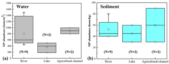 MP abundances within different environments. (a) MP abundances within different water bodies; (b) MP abundances within different sediments. (The little box represents the average value, and the horizontal line in the middle of the box represents the median).
