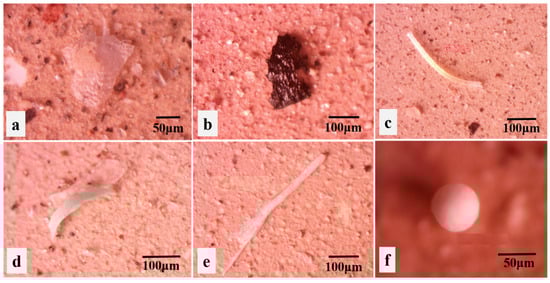 Typical microscopy images of MPs (films (a,b), fiber (c), fragment (d), foam (e), and granule (f)).