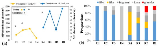 Abundance (a) and composition characteristics (b) of MPs in different sampling sites from the upper and lower reaches of the Brahmaputra River. Some data (U1, U2, U3, and U4 sites) from [].