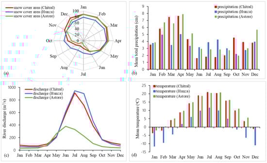 The Astore basin is located at latitude 35°33′ N and longitude 74°42′ E and covers an area of 3990 km (Figure 1). The mean elevation is about 4100 m A.S.L., with maximum elevation reaching above 8000 m A.S.L (Figure 2). Approximately 15% (607 km2) of this area is covered with snow and glaciers [61]. The mean snow cover area, mean total precipitation, mean monthly discharge, and mean monthly temperature of the study area are shown in Figure 3.