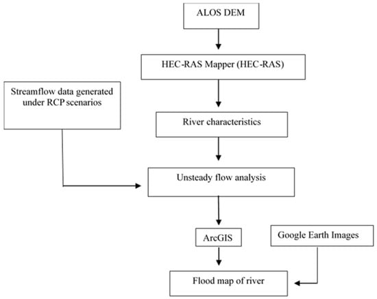 This study used the 2D capacity of HEC-RAS for developing floodplain maps of the study area. A flowchart of the methodology used is presented in Figure 4. The Digital Elevation Model (DEM) of the study area is a topographical map that includes terrain properties. The 12.5 m ALOS DEM was used to delineate the hydrographic network in the HEC-RAS version 5.0 for each basin. The geometry of the river reaches and the flow data are important parameters for flood mapping in HEC-RAS. The next step was the representation of the terrain, using RAS Mapper to view maps and data spatially. To create the geometry of the basin, a 2D flow area tool was used to draw a polygon, near the outlet of the basin, which defined the area selected for the simulation. The first boundary condition was drawn upstream, whereas second one was drawn downstream of the river. After defining the boundary conditions upstream and downstream of the river, computational points were generated with a grid size of 20 for both horizontal and vertical spacing. While low resolution yield faster simulations, smaller grid sizes represent the terrain better, but require a longer calculation time. Normal Depth was used for the downstream boundary condition, whereas Manning’s Roughness coefficients for the river reaches were assigned according to the HEC-RAS Hydraulic Reference Manual. A Flow Hydrograph was used for the upstream boundary. The Flow hydrograph window was filled using a fixed start time and introducing flow values for 2 months (June–July), as these months show the highest flow peaks. Unsteady flow was simulated using unsteady flow analysis. The results were accessed using RAS Mapper and visualized by activating velocity, WSE (Water Surface Elevation), geometry, and depth. The Google Earth image was added from Map layers of HEC-RAS to visualize the flood-prone and -affected areas around the river’s mapped area.