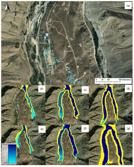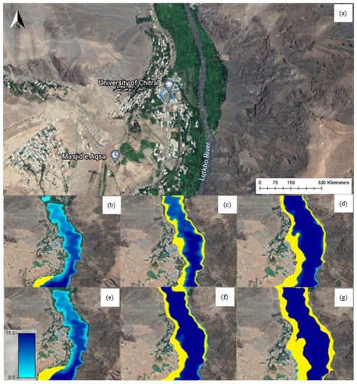 The maximum runoff in the Chitral river was observed on 14 July and was 1123.30, 1154.60, and 1194.70 m3/s for RCP mid- (2.5, 4.5, and 8.5) and 1181.80, 1180.60, and 1309.50 m3/s for RCP late- (2.5, 4.5, and 8.5) 21st century scenarios. The underlying area of the Chitral river simulation is shown in Figure 5a. The results of RCP late 21st century showed greater flow depth and extent as compared to the flow simulated under mid-21st century scenarios (Figure 5).