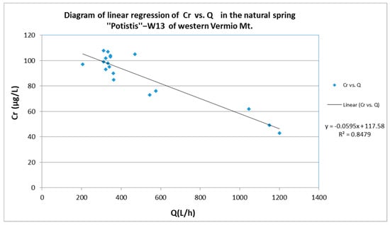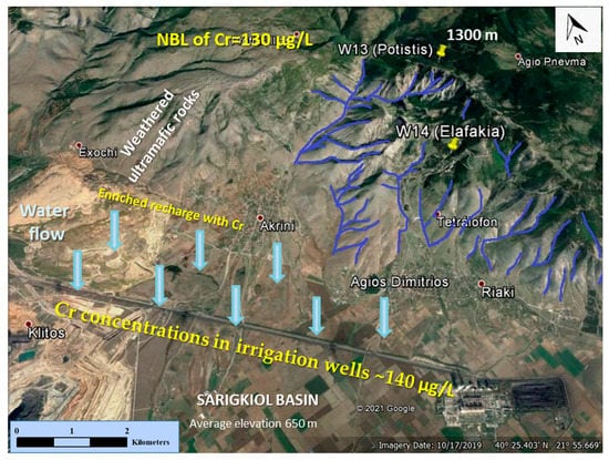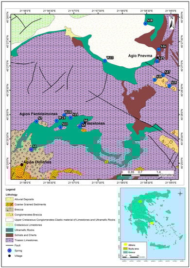 In the Agios Panteleimonas area, the natural spring “Elafakia”‒W14 and in the Agio Pnevma area, the natural spring “Potistis”‒W13 were examined separately from the other springs in these areas because of their elevated groundwater concentrations of Cr.