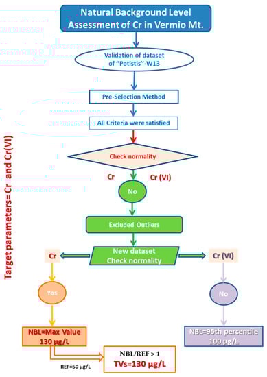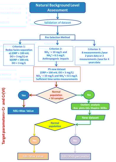 The applied methodology for the assessment of NBLs of Cr is described in detail in Figure 4. The pre-selection (PS) method, which is widely applied worldwide, was employed to select the suitable spring water samples for the NBLs assessment [10,16,57,58,59,60]. The PS method constitutes the methodology geochemical approach to validate the dataset according to similar geochemical characteristics and recognize the water samples that are affected by anthropogenic activities. In the first stage, the hydrochemical facies were selected based on the DO concentrations and Eh (ORP) [61]. The first dataset group included the water samples with ORP > 100 mV and DO > 3 mg/L. All water samples from the natural springs satisfied this criterion. The next criterion included consideration of redox conditions; if the prevailing conditions were oxidizing, then the concentrations of NO3− < 10 mg/L would be considered and if the conditions were reducing, then the NH4+ < 0.5 mg/L would be considered [9,61,62] to exclude the samples affected by anthropogenic activities [62,63]. Based on this criterion, the samples with NO3− > 10 mg/L were considered to be affected by anthropogenic activities and thus, were excluded from the new dataset. The next criterion required eight measurements per year for two years or two measurements per year for at least four years to exist for each spring [16].