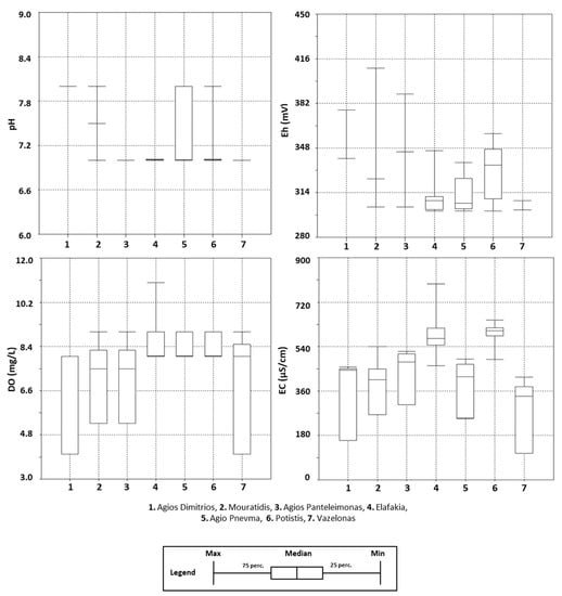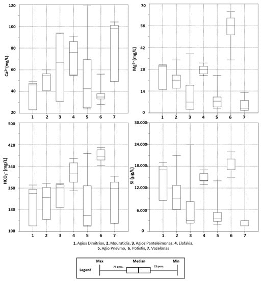 Box plots depicting the variation of eight groundwater quality parameters (pH, Eh, DO, EC, Ca2+, Mg2+, HCO3− and Si) are given in Figure 6 and Figure 7. The alkalinity of the water samples was calculated in a range of 1.95 × 10−3 meq/L (S18) up to 6.71 × 10−3 meq/L “Potistis”‒W13, with an average value of 4.60 × 10−3 meq/L.