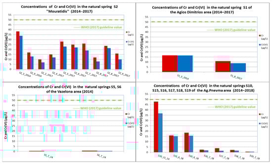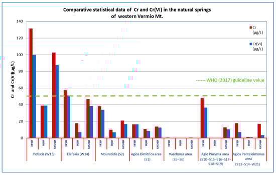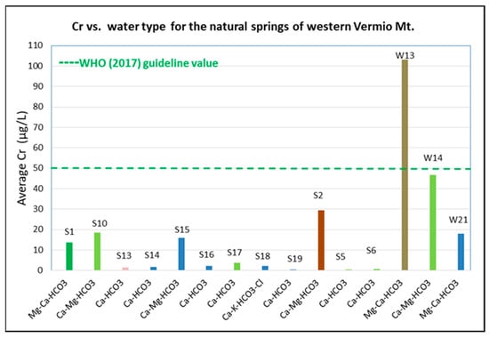 The abundance of major ions varied significantly among the natural springs (Table 4). Concentrations of Cr and Cr(VI) exhibited a wide range of values (Table 1, Table 2 and Table 3, Figure 8, Figure 9, Figure 10 and Figure 11). Most physical and chemical parameters (e.g., EC, NO3−, SO42−, As, B, Ba, Cd, Cu, Ni, Pb, Sb, Se, Zn, etc.) in the natural springs of Vermio Mt. exhibited lower concentrations than the desirable and permissible limits for drinking water. All samples were compared with the guideline of WHO for drinking water [66]. Exceedances were recorded in the natural springs “Potistis”‒W13, “Elafakia”‒W14, S1‒Agios Dimitrios area, and S18- Agio Pnevma area. Specifically, in the spring S18‒Agio Pnevma area, concentrations of K+ exceeded the guideline value of 12 mg/L for drinking water (WHO, [66]). Two exceedances of As, above the permissible limits of 10 μg/L, were recorded in the natural spring S1 of the Agios Dimitrios area. In the spring “Elafakia”‒W14 seven water samples exceeded the WHO guideline value of 50 μg/L for Cr concentration for drinking water [66], while in the spring “Potistis”‒W13 23 water samples exceeded this value. Finally, in total, three samples (one from the spring “Elafakia”‒W14, and two from the spring “Potistis”‒W13) exceeded the limit of 20 μg/L for the concentration of Ni for drinking water [66]. The systematic exceedances of Cr in the natural springs of Vermio Mt. were the principal reason for selecting Cr as the target parameter for NBLs assessment in this area.
