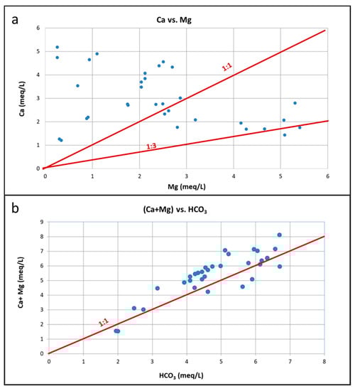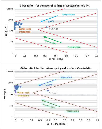 The dominant hydrochemical types of the studied natural springs of western Vermio Mt. were Ca-Mg-HCO3 (40% of the water samples), Mg-Ca-HCO3 (33% of the water samples), and Ca-HCO3 (21%) (Figure 12). Other transitional water types in the study area comprised Ca-K-HCO3-Cl (3%) and Ca-HCO3-SO4 (3%). Based on the type and the geological environment of the springs, the Ca–HCO3 waters are considered to originate through the interaction of meteoric water with rocks containing Ca-bearing minerals, whereas water types enriched in Mg, were derived from the dissolution of ultramafic rocks [29]. The mixed Ca-Mg-HCO3 type indicated fresh recharge waters mainly related to carbonate rocks and less to ultramafic rocks. The Mg-Ca-HCO3 water type represents recharge waters related to Mg-rich rocks, suggesting the strong interaction with the ultramafic rocks of the area [67]. The springs “Potistis”‒W13, S1, and W21 that belong to this type are associated with fissured aquifers in strongly serpentinised ultramafic rocks, or they are in hydraulic connection with them.