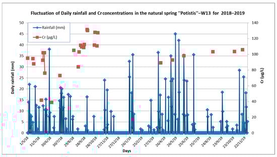The spring “Potistis”‒W13, presents great interest, because of the very high concentrations of Cr it exhibits [45]. The spring “Potistis”‒W13 flows out at an elevation of 1300 m in an ultramafic environment characterized by the absence of any anthropogenic activities. It constitutes a contact-type spring in the contact of conglomerates with ultramafic clastic material and limestones and ultramafic rocks. The aquifer, which discharges via the spring, flows through a weathered zone in serpentines. The natural recharge comes mainly from the seasonal precipitations via the permeable upper unsaturated zone (conglomerates, clastic material of ultramafic rocks, and limestones). The recharge water is mainly enriched with released PTEs (mainly Cr) from the ultramafic rocks, as the rainfall infiltrates through the weathered fractured ultramafic rocks. An additional lateral recharge takes place due to secondary porosity in the fractured ultramafic rocks. The high permeability of the unsaturated zone due to the presence of conglomerates in this area facilitates the direct recharge of the aquifer in a short time. The range of discharge was calculated from 205 L/h up to 1200 L/h, with an average value of 482 L/h. In Figure 3, the simplified hydrogeological section describes the natural recharge and the operation mechanism of the spring “Potistis”‒W13.