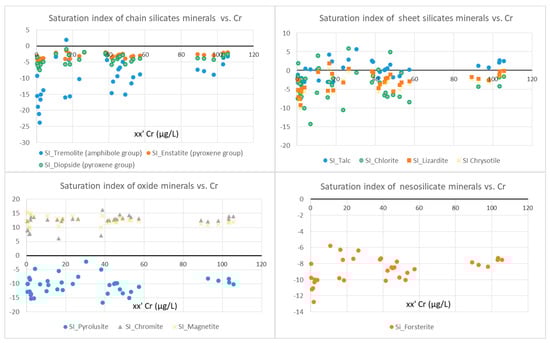A positive SI indicates that the mineral is oversaturated or supersaturated with respect to the solution [56]; thus, the mineral could precipitate. Conversely, a negative SI indicates that the solution is undersaturated with respect to the selected mineral, suggesting that the mineral is dissolved in groundwater to reach equilibrium.