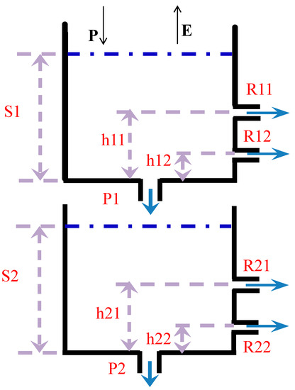 The tank model simulated the rainfall–runoff process in the paddy field. According to the hydrological and geological characteristics of the irrigated district, the rice field between two channels was regarded as a hydrological unit, and a two-layer tank model developed by [27] was run on each unit. In the rainfall drainage process, the excess water from the paddy field was drained into the river channel through the outlet of the drainage ditch. Figure 2 showed the structure of the two-layer tank model.