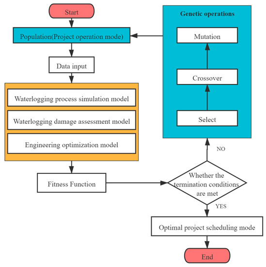 The optimal operation of drainage work is a complex, multistage decision-making problem. The model in this paper contains many decision variables and complex constraints. The influence of decision variables on the objective function needs to be calculated through tricky runoff generation and affluxion, as well as waterlogging loss. Therefore, genetic algorithm [30] with the global optimization function was selected to solve the model. The calculation process of the optimal scheduling mode of waterlogging removal work deduced by the genetic algorithm is shown in Figure 3.