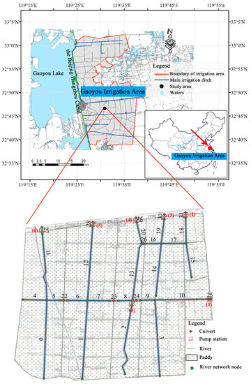 Gaoyou Irrigation District is a typical plain irrigation area in the east of China, located in Yangzhou, Jiangsu Province. The irrigated district covers 650 km2, composed of independent polders such that there is no water exchange between them. Therefore, this study only selects a specific agricultural field, Longben Polder, as the object to study the operation mode of drainage work.