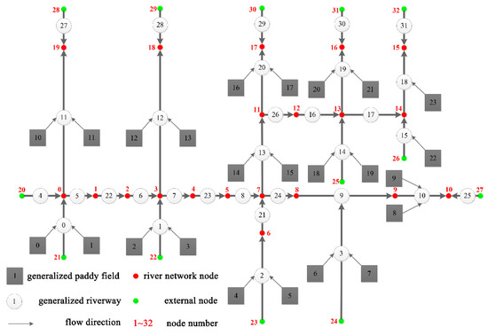 As shown in Figure 5, the study area was divided into 23 fields. There are a total of 32 nodes and 31 riverways (including hydraulic structures) in the study area. Riverways relate to each other by nodes. Due to the small scope of the study area, each channel is divided into five equally spaced sections in the hydrodynamic calculation of the river network. As a result, the flow direction of the river in the plain river network area is uncertain. Therefore, for the sake of convenience, the assumption of the flow direction of the river is made: For the outer river channel, the flow direction is positive from the external node to the internal node—that is, when the calculated flow is positive, the flow direction of the river channel is from the external node to the internal node; otherwise, it is from the internal node to the external node. For the internal channel, the flow direction is assumed to be positive from east to west and from south to north. In this paper, all pumping stations and culverts are generalized as river channels with a length of 0 and are numbered uniformly.