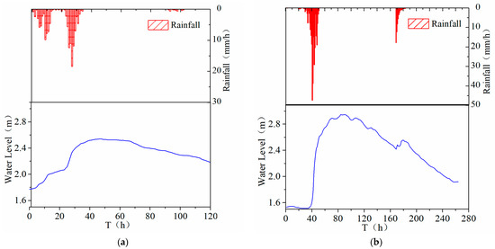Rainfall Event 1 occurred from 13 August to 18 August 2014 (Figure 6a). The cumulative rainfall was 133.8 mm, the maximum 24-h rainfall was 108.8 mm, and the peak intensity was 18.4 mm/h. As a result, the lowest water level of the Nanchengzi River was 1.77 m, and the highest water level was 2.54 m. Furthermore, all drainage works were not scheduled during the rainfall, i.e., all of the pumping stations were closed during the deluge.