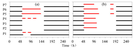 Working flowchart of pumping stations in Rainfall Event 2. (a) Original operation and (b) optimized operation. Black represents gates and red represents pumps. Serial number of pump Station: P1—Heping, P2—Kouhe, P3—Nijia, P4—Hongqi, P5—Jiangmahe, P6—Zhongshihe, P7—Lvyanghe.