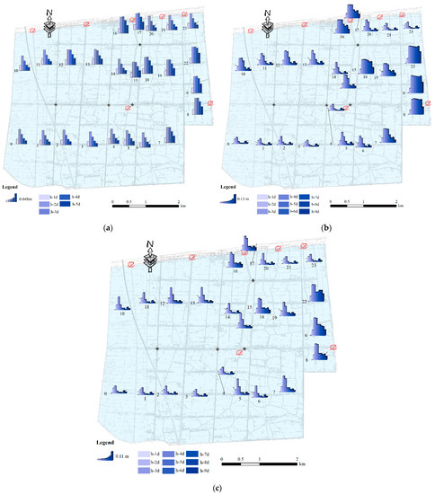 Rainfall Event 2 occurred from 9 to 21 August 2015 (Figure 6b). The rainstorm was of a typhoon-type, with the cumulative rainfall reaching 271.6 mm, the cumulative maximum rainfall in 24 h reaching 269.2 mm, and the maximum rainfall intensity reaching 47.4 mm/h. Such rainfall intensity is enormous, equivalent to the standard of once in 100 years in Gaoyou City. The river water level was 1.53 m at the initial rainfall stage, and the peak water level was 2.95 m.