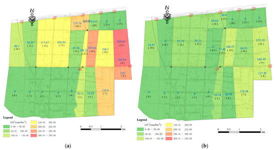 It shows that the waterlogging vulnerability of the paddy field is greatly affected by both the discharge condition of the paddy field itself and the river level. For the area with higher terrain, the jacking effect caused by river water level is negligible. Hence, the variation of flooded water depth was caused by the combined effect of rainfall intensity and the drainage capacity of ditches. While in low-lying areas, the water depth of the paddy field is prone to being affected by river level. It will form a jacking when the river level is too high, which will affect the drainage speed and even cause backward water flow. The distribution of losses caused by waterlogging for the original and optimized scheme is shown in Figure 9. In the original operation, the heavy losses, 229,000~302,810 yuan/km2, occurred in a small part located at the eastern part of the study area. In Figure 8b, the reduction of average loss per km2 was 13,670~166,530 yuan, which showed different decreases compared with the original operation in other regions. We found the most significant improvement in units with high vulnerability. By adopting the optimized scheme, the total yield loss of rice decreased by 35.4% to 1.589 million yuan, compared with 2.459 million yuan in local practice. The effect was very significant. The total of yield losses and operating costs of pump stations was 2,196,300 yuan, which decreased by about 33.8% compared with the original loss.
