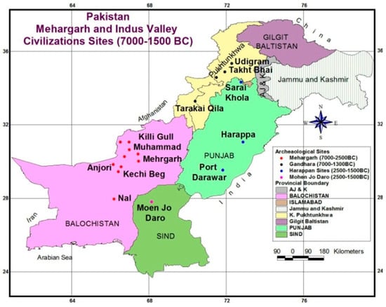 The earliest evidence of pastoralism characterized by the taming of sheep, goats, and cattle with limited cereal cultivation was best documented in Kile Gul Mohammad in the Quetta Valley in Baluchistan, Udigram in Swat, Khyber Pukhtunkhwa and the contiguous area of Indus Valley in Pakistan, dated to approximately ca. 4000 BC [12]. The indigenous process of plant and animal domestication in Neolithic settlements has been traced back to as early as ca. 7000 BC near a village Mehrgarh at Bolan Pass (Kachi plains) of Baluchistan and represents a moderate weather condition [13].