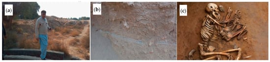 (a) Flood deposition, (b) sand stratigraphic layers, and (c) improper laying down of bones of a mother and her child. Harappa, field visit, 2020.