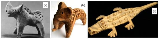(a) Rhinoceros, (b) elephant, and (c) crocodile artifacts, Indus Valley, showing sub-humid-to-humid climates, (adapted from [21]).