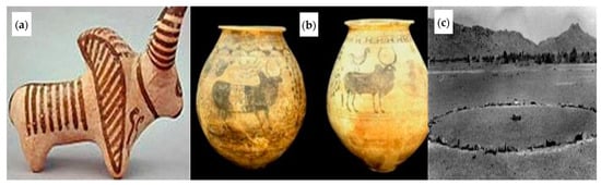 In the ancient era, the inundations owing to melting glaciers were possibly higher than at present, but the summer monsoon inundations would have had a flatter shape of hydrography owing to the slowdown of surface flow by vegetation cover. This would have led to a flood regime with less variability than at present and shows a humid-to-sub-humid climate across the plain and a wet climate in the catchment area of the Indus River [18,19]. Then, there is also the matter of the affiliation of the Indus Valley civilization landmass to the flora [14,20,21] in the shape of artifacts, seals, animal bones, and figurines (Figure 3 and Figure 4). It was observed that, when the essentially recognized biological habitats of these animals, as well as vegetation, were evaluated, they were moderately affiliated than the stereotyped habitat commonly connected with them. Most previous works discussed a different habitat of flora and fauna, which comprises a mixture of dry forests, scrub forest, and marsh, a depiction which vigorously illustrates the riverine strip of the Indus civilization [15]. The botanical analysis of the remnants summarizes, “all flora and fauna remain to guide a single sense, that, 4000 years before, close to about Harappa, there was scrubby vegetation marshy patches and elevated grasslands with a limited precipitation” [22].