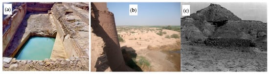 (a) Water reservoir at Dholavira, (b) water dam and rivulet at Port Darawar, Indus Valley, and (c) water check dam at Toung Valley, Mehrgarh (field visit, 2020; adapted from [26]).