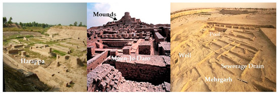 This study elaborates the historical background, drainage, town planning, sanitation, toilets, sewerage, water reservoirs, baths, irrigation, wells/ground tunnels, water-related tools, and dockyards of the Mehrgarh and Indus Valley civilizations. The archaeological site of Harappa is located at 30°–53′ north latitude and 72°–75′ east longitude along the eastern bank of the Indus River in Punjab, Pakistan. Moen-Jo-Daro is located at 27°–42′ north latitude and 68° east longitude along the western bank of the Indus River, approximately 28 km southwest of Larkana city, Sindh Province, Pakistan. Mehrgarh is located at 68°–8′ east longitude and 27°–19′ north latitude near Bolan pass, Balochistan (Figure 1). As the secondary data of weather elements of that time were not available, the predictions were mostly made from the remains of vegetation, human bones, fauna, artifacts, and construction materials. The information predicted from the remains was observed in the context of the existing climate condition, as well as water technologies, and generalized for the purpose of reaching the objectives of the work.