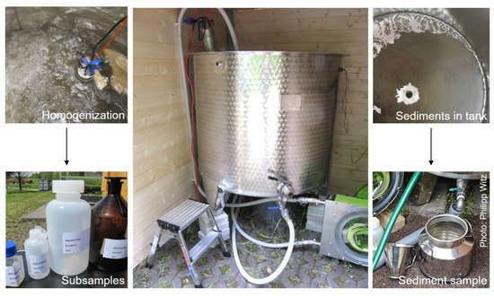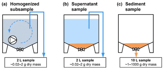 Sedimented samples are used for particle analyses and for quantifying loads based on high solids masses [22,24]. For this purpose, composite samples are left to settle for 1–2 days until settling is completed, according to visual inspection. Considering particle settling velocity distributions of combined sewage reported in the literature [38], e.g., [39], all settleable solids should settle in the tank within one day. Grab samples from the supernatant water are collected (Figure 2b) to quantify the remaining suspended solids concentration, or to analyze dissolved substances. From a bottom valve, the first flush of sediments is collected into a 10 L sampling container before the supernatant water is drained at low speed to avoid flushing of sediments. Afterwards, all remaining sediments are mobilized using supernatant water and quantitatively collected in a 10 L sampling container (Figure 2c). In this way, the complete dry mass is sampled for analysis.