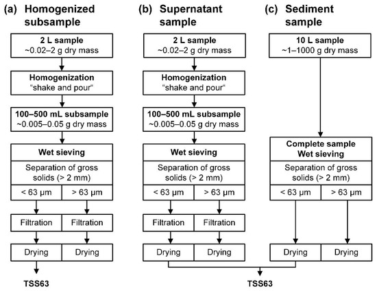 For both homogenized and sedimented LVS samples, wet sieving was used to separate TSS63 and TSS 63–2000 µm. Since sample volume and solids content differed significantly between the sample types, different analytical methods were required.