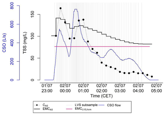 Evolution of the TSS event mean concentrations (EMCAS) derived from the autosamplers pollutograph (CAS) during a combined sewer overflow (CSO) event compared to the EMC derived from the large-volume samplers (EMCLVS,hom).
