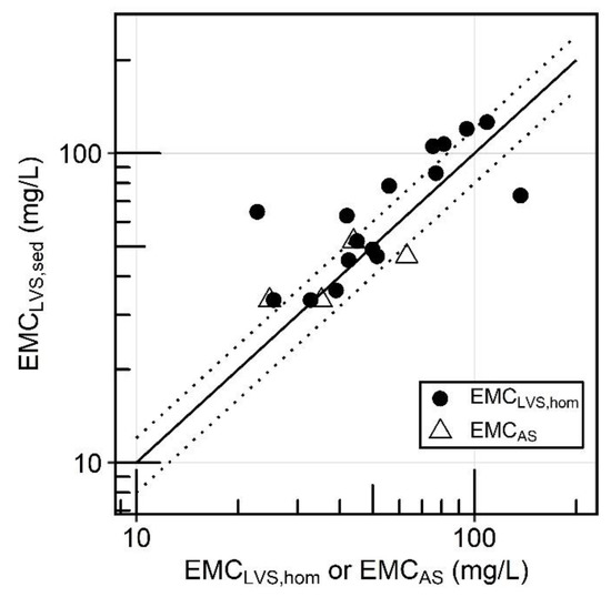 On average, EMCLVS,sed tended to be slightly higher than EMCLVS,hom, notably for concentrations >50 mg/L. This could indicate that LVS homogenization and subsampling was not sufficiently representative. The potential bias introduced by improper subsampling is known from comparisons of TSS and suspended sediment concentrations (SSC) results [44,45,46,47]. According to American standard methods, TSS are determined by filtration of a subsample, while SSC are determined from the entire sample volume [7]. If the PSD of a sample includes sand-sized particles, subsampling will likely be less representative and tend to underestimate the solids concentration [44,45]. The SSC method was demonstrated to representatively quantify EMC compared with whole-storm samples from parking lot runoff collected in a 15,000 L sample basin [48]. In this context, sedimented LVS samples might be more comparable with SSC analytical procedures. Given that the results from homogenized samples were generally confirmed by AS, this would mean that both AS and homogenized LVS could possibly underestimate TSS-EMC.