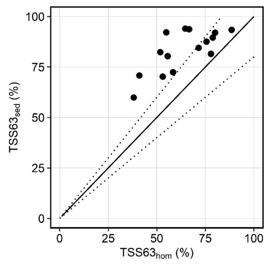Scatterplot of the percentage of TSS <63 µm measured in homogenized (TSS63hom) and sedimented (TSS63sed) large-volume samplers samples. Dotted lines show 20% deviation.