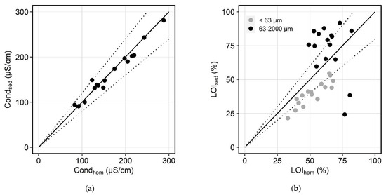 Scatterplots of conductivity (Cond) (a) and loss on ignition (LOI) (b) measured in homogenized (hom) and sedimented (sed) large-volume samplers samples. Dotted lines show 20% deviation.