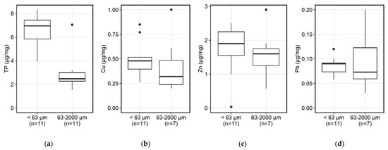 There was a tendency to higher pollutant loading of TSS63 when compared with solids > 63 µm, which can be attributed to the higher specific surface area of the smaller particles. However, the difference between both fractions was significant for TP only (Mann–Whitney U Test, p < 0.001). In addition to the specific surface area, there are other parameters influencing metal adsorption, such as organic carbon content, effective cation exchange capacity, and clay-forming minerals content [36]. Kemper et al. [24] suggest that the pronounced difference for TP is due to higher content of iron oxides in the fine fractions that have a high sorption potential.