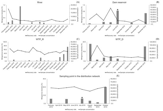Mengovirus recovery rates and levels of water concentration, over the 2019 sampling campaign (addition of mengovirus during the filtration/primary concentration step), for the water collected at the five sampling points: (A) River (n = 16); (B) Dam reservoir (n = 9); (C) WTP_R (n = 16); (D) WTP_D (n = 9); (E) Sampling point in the distribution network (n = 9). The asterisks point to the three samples evaluated (and positive) for mengovirus infectivity.