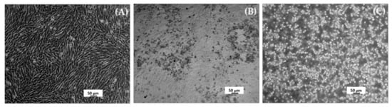 For mengovirus production, a volume of 10 μL (corresponding to 106 genomic copies) previously thawed from a frozen (−20 °C) mengovirus solution (bioMérieux; Marcyl’Etoile, France) was incubated with the cells, after having been diluted in 1 mL of virus-production medium (maintenance medium supplemented with 2% FBS). After an incubation of the virus with the cells for two hours, 3 mL of virus-production medium was added, and the infected culture was maintained at 37 °C and checked daily under a microscope Zeiss Axiovert 200 (Göttingen, Germany), until the appearance of cytopathic effect (CPE); images were recorded with a Zeiss AxioCam HRc digital camera and Axiovision program (München-Hallbergmoos, Germany). Then, the culture medium with detached cells was collected and clarified by low-speed centrifugation (3000× g for 5 min); the supernatant (mainly extracellular virions in suspension) was recovered, aliquoted and frozen at −70 °C.