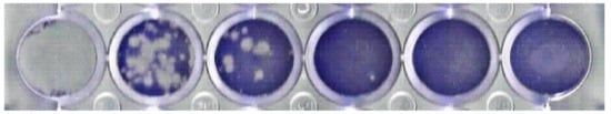 Mengovirus was produced in Vero E6 cells grown in CO2 independent medium (Figure 2A), causing CPE (rounding and detaching of the cells) to the cultured cells (Figure 2B,C). The clarified supernatant of the infected culture displaying total CPE was titrated as described in Section 2.4, presenting a titer of 2 × 106 PFU/mL, as shown in Figure 3.