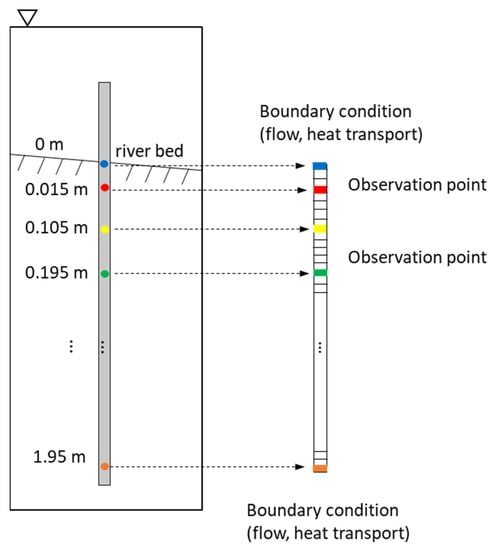 The objective of this study was to test the use of ML methods to infer 1D vertical flow. Therefore, a 1D model simulating flow and heat transport was built to generate the subsurface temperature and pressure time series at multiple depths and the corresponding exchange fluxes at the streambed. The 1D vertical model is 2 m in vertical extent with a spatial resolution of 0.01 m; this high spatial resolution was necessary to provide accurate temperatures and pressures at the observation depths. The boundary conditions applied to the 1D model were extracted from the 3D model, thereby transferring as much of the information from the 3D system as possible. The top and bottom boundaries of the 1D model were of Dirichlet type for both flow and heat transport. The 1D model was homogeneous, with a permeability equal to that of the alluvium layer, 3.86 × 10−11 m2. The simulation period was 1 January 2016–30 June 2017 (1.5 years) with temperature, pressure, and streambed flux generated every 5 min.