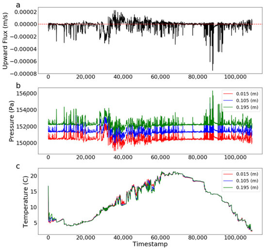 Time series of (a) surface/ground water exchange flux across the streambed, (b) pressure at three depths, and (c) temperature at three depths.