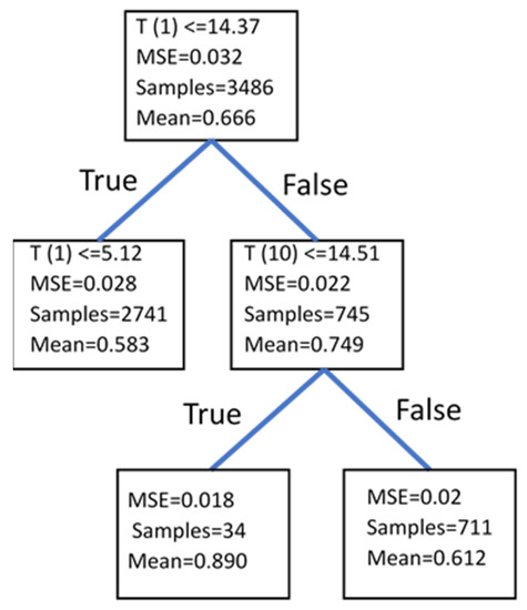 A strength of RT is its ease of interpretation. Consider the illustrative example shown in Figure 3. Temperatures measured at ten depths, T(1) through T(10), were considered to form a tree with only two children formed at each node and two levels of nodes. The initial set, including all the training fluxes, was composed of 3486 samples with a mean value of 0.666 m/s; the MSE between all the flux values and the mean was 0.032. The RT process identified the shallowest temperature observation, T(1), with a threshold of 14.37 °C as the first feature for classification. This divides the fluxes into two groups with mean values of 0.749 and 0.583 and sample sizes of 745 and 2741, respectively. The sample-weighted MSE can be calculated for each split by multiplying the MSE of that set by the number of samples in the set after splitting normalized by the total number of samples. In the illustrative example, the sample-weighted MSE after splitting was 0.022. The left branch identified T(1), again, as the best criterion with a threshold of 5.12 °C, but this did not meet the minimum required improvement in MSE to continue, so this branch was terminated without splitting. The right branch identified T(10) with a threshold of 14.51 °C. This split met the variance reduction criterion, so the samples were divided into two subsets with mean values of 0.890 and 0.612 m/s. To apply the RT at some time, t, in the testing set, only T(1) and T(10) would be considered. If these values were T(1) = 15.0 and T(10) = 13.2, then the binary classification at each branch leads to the central box with a mean value of 0.890 m/s. This value of predicted flux at that time would be compared to the known flux at that time to assess the performance of the trained RT.