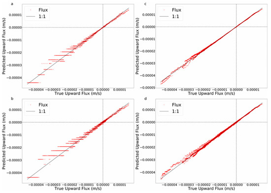 Temperature-based methods were developed for field use because temperature sensors are more robust and less expensive than pressure sensors [14,15,16,17]. Therefore, despite the clear preference for pressure observations, we continued our examination of the possible use of temperature only. Because regression trees are greedy, and we showed that pressure observations are more important than temperature observations, we can only assess the value of temperature observations by removing the pressure data from consideration. Even considering model-generated data with no added noise (Figure 7a), there was clear degradation of the accuracy of the inferred flux when using only temperature data. The results are improved somewhat for GB (Figure 7b). However, neither was tree-based ML able to predict the surface exchange flux with high temporal resolution based on temperature observations with added measurement error with an SNR of 100 (Figure 7c,d). We also examined whether RT or GB could resolve the average flux calculated over nonoverlapping 30-min windows; yet, the results were not improved significantly (not shown).
