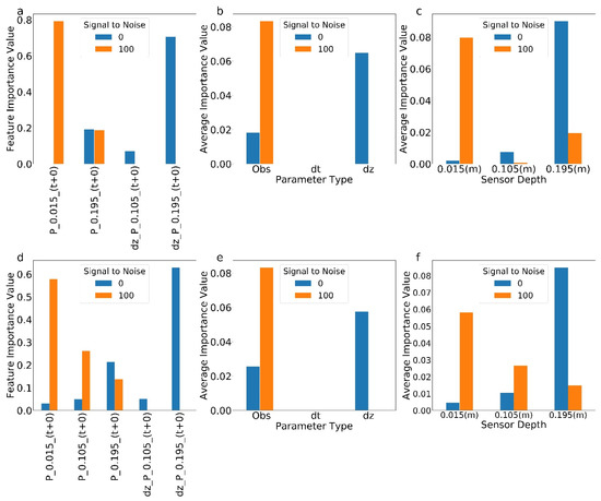 Figures (a) through (c) show results for RT; (d) through (f) relate to GB. (a,d) Feature importance for pressure and temperature observations (P and T) and spatial (dz) and temporal (dt) gradients for sensors at 0.015, 0.105, and 0.195 m depths with (orange) and without (blue) measurement error. The time delay after the flux estimation is shown in parentheses, and features with less than 0.001 importance value are not shown in the x axis. (b,e) Summary of feature importance by type–observed value, temporal gradient (dt), and spatial gradient (dz). (c,f) Summary of feature importance by depth.