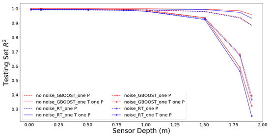 The clearest result is that only pressure and spatial gradients of pressure were identified as important features for RT and GB and for data with and without added noise (Figure 6a,d). This was expected given that pressure is more directly related to flux, through Darcy’s Equation, than is temperature, through heat transport and through the advection dispersion equation. In addition, all of these features were collected at the time of flux inference. This likely indicates that the pressure associated with the exchange flux propagated through the system very quickly. There are some consistent impacts of added noise for RT and GB. Specifically, without noise, both algorithms preferred spatial gradients of pressure collected at greater depth. Adding noise increased the reliance on direct measurements at shallower depths. This, again, is consistent with our expectations: with added noise, the absolute signal should be increased (shallower rather than deeper measurements), and instantaneous gradients will magnify measurement errors (observations rather than calculated gradients). The fact that these results, based only on the feature importance, agree with our expectations based on physical insights give us more confidence in the use of tree-based ML methods to identify optimal observation sets. Importantly, this approach to measurement network design does not require the computationally expensive combinatorial analyses that are common for these investigations. The design recommendations are produced automatically as part of the ML training.