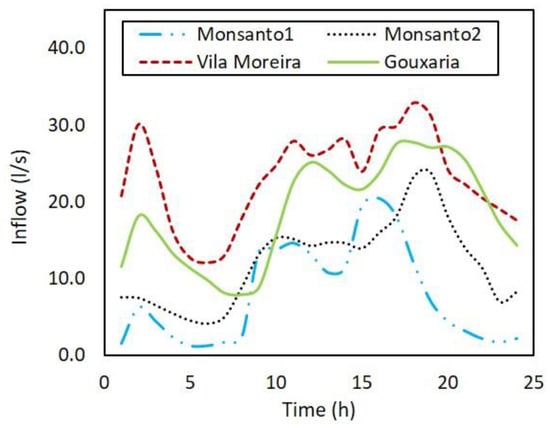 The model was applied to the three main trunk sewers (Monsanto, Gouxaria and Vila Moreira). Around 40% of industrial units are monitored by the utility, and therefore those wastewater flows were input directly in the model. For the remaining fraction, a dry weather pattern was created (Figure 2), based on data from each of the installed flow meters, evenly distributed to model nodes where those industries were located. It was assumed that those industries had no additional sulfide inflows, according to historical knowledge by the utility.