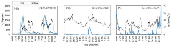 H2S in the sewer headspace during the monitoring period evidenced significant concentrations, at times over 3000 ppm. Several measurements were carried out continuously, during 5-min time steps. Figure 3 depicts H2S concentration and wastewater inflow results for 2 consecutive days at P1 to P3 locations (P4 was not included since no flow meters were installed at that section).