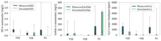 In order to fit the high median sulfide concentrations, the model seems to under predict DO concentration to some extent, mostly visibly in P1b and P3, which could also be partially attributed to sampling errors. However, the prediction capability for sulfide and H2S seems to improve, with simulated median concentrations falling within the 25th and 75th percentiles of measured values.