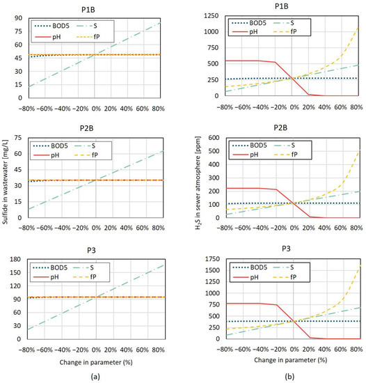 Spider plots of the relationship between model parameters pH, BOD5, S, fp and model outputs: (a) sulfide concentration in wastewater (mg/L), and (b) H2S concentration in sewer headspace (ppm).