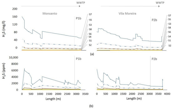 Simulation results for H2S concentration at Monsanto and Vila Moreira trunk sewers for all eight scenarios: (a) in wastewater (H2SL, mg/L), and (b) in sewer headspace (H2S, ppm).