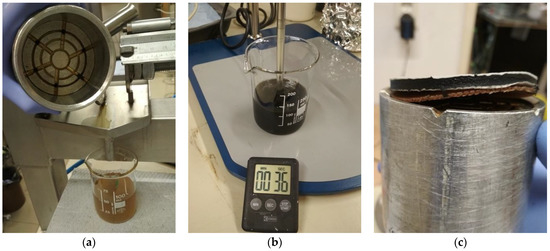 Digestate dewatering by mechanical pressing: (a) digestate with flocculant dosage; (b) mixing at 700 rpm for 3 min; (c) dewatered digestate.